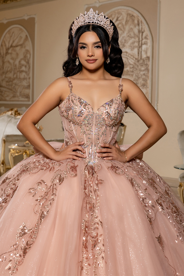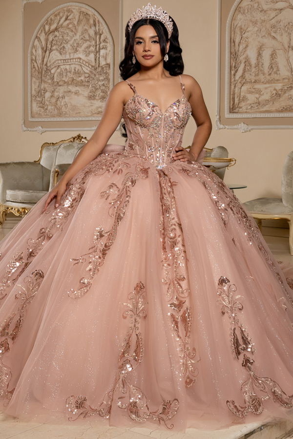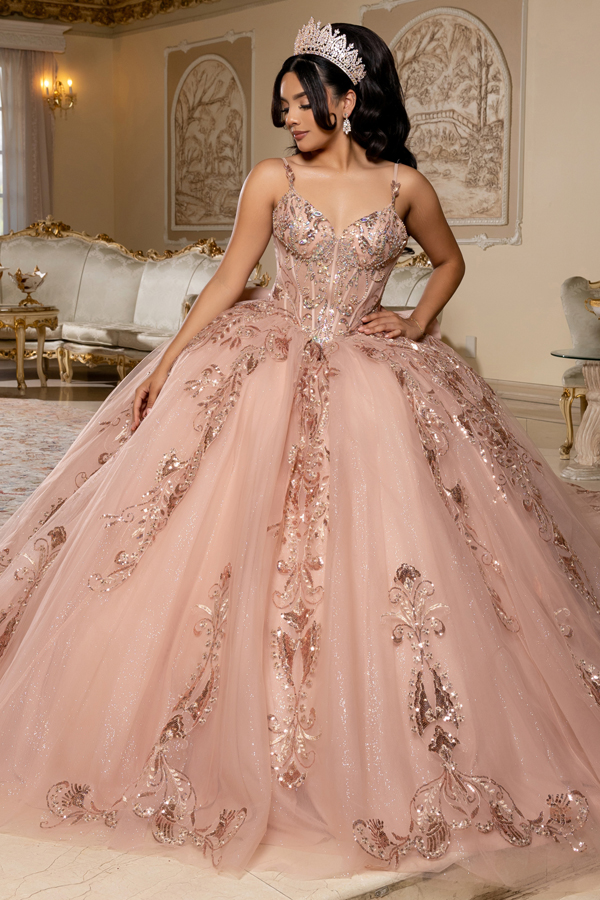 Bead/Sequin Works, Jewel Detail, Sleeveless Spaghetti Straps Basque Waist Ball Gown