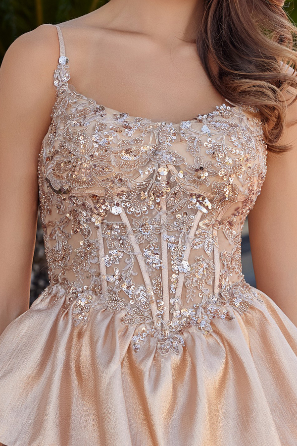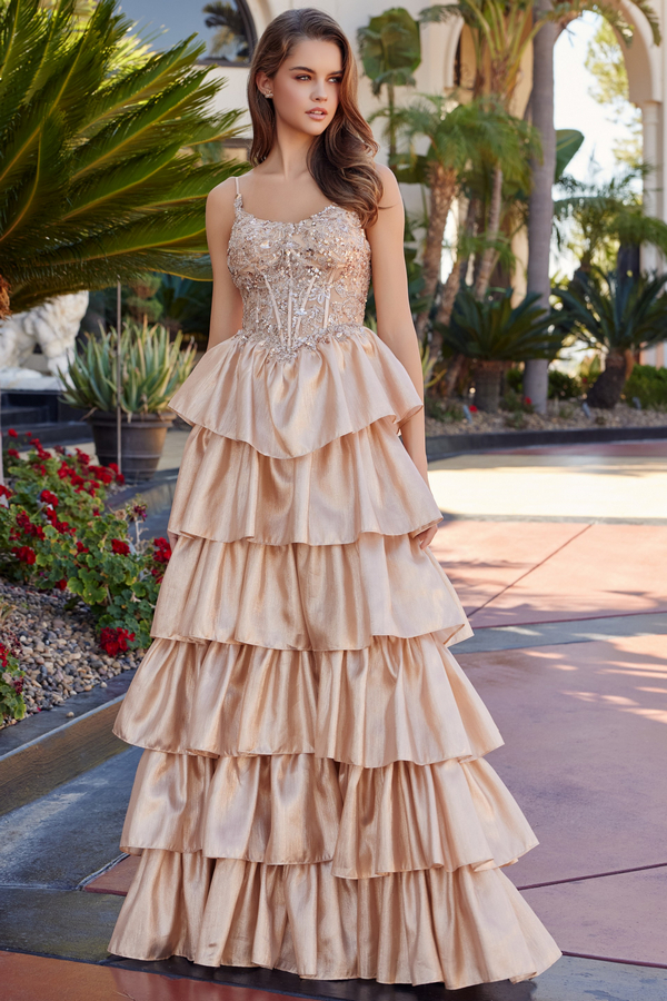 SHINY ORGANZA SCOOP BUSTLINE BEAD/SEQUIN WORK AND BONED WAISTLINE WITH SPAGHETTI STRAPS AND A MULTI LAYER SKIRT LACE UP BACK