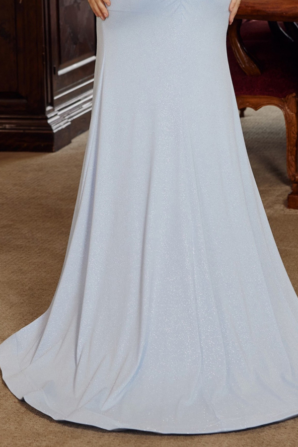 FITTED FULL SHIMMER JERSEY GOWN WITH A DEEP V SWEETHEART NECKLINE THE BONED BODICE HAS OFF SHOULDER SLEEVES AND A LACE UP BACK COVERED IN STUNNING WOVEN EMBELLISHMENTS COMPLETE WITH A THIGH HIGH SLIT.