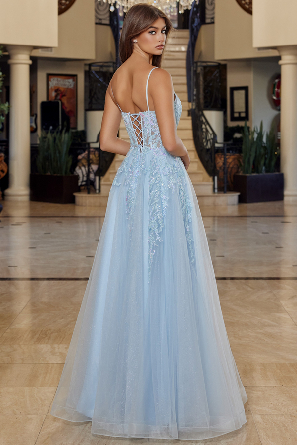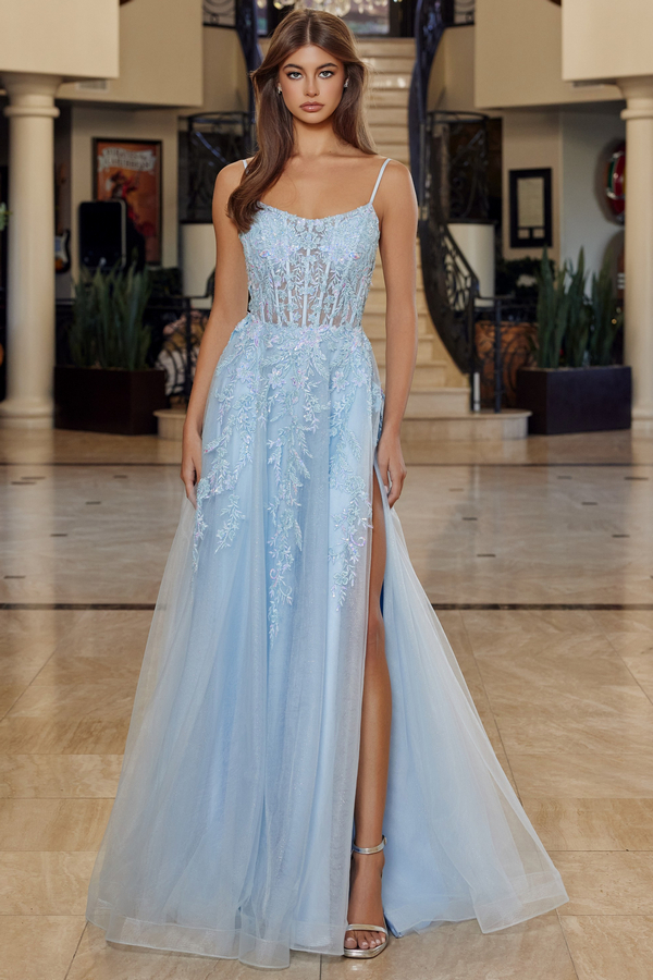 A LINE LONG GOWN SCOOP NECKLINE THIN STRAPS FULL EMBROIDERY BODICE WITH SHEER BONED WAISTLINE AND A HIGH SLIT WITH A COURT TRAIN ANDA LACE UP BACK.