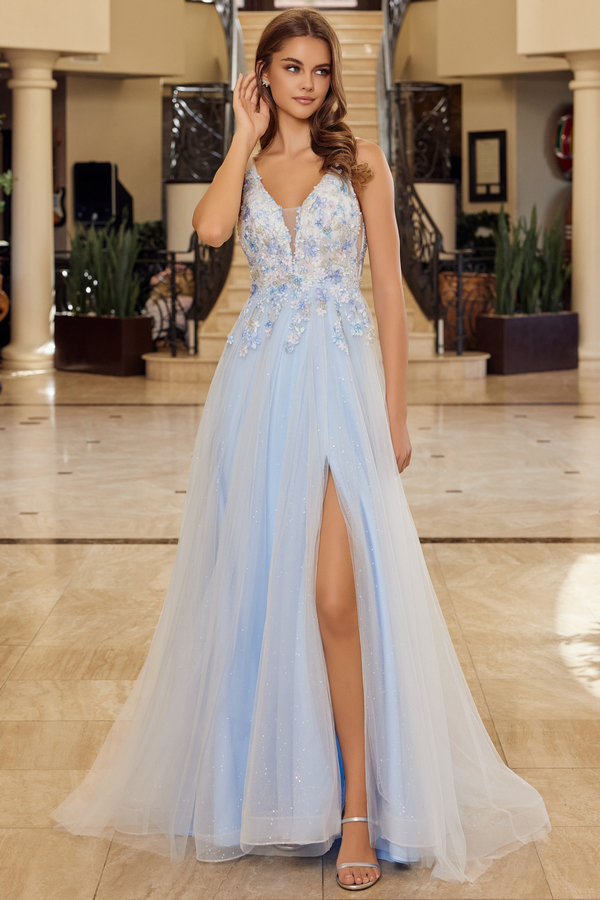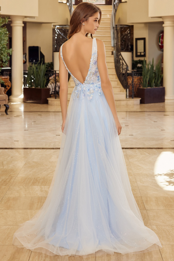- Sleeveless Plunging V Neck A Line Prom Gown