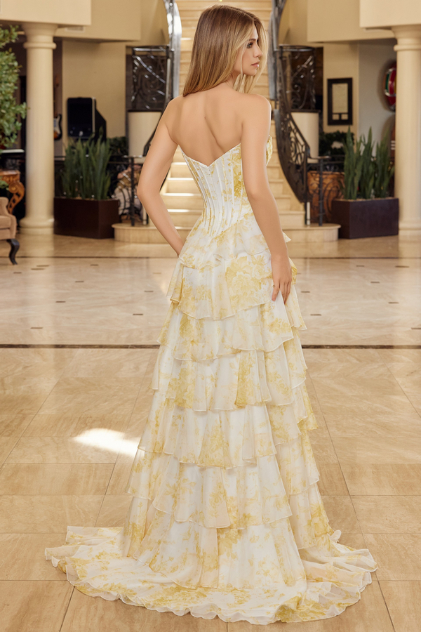 STRAPLESS RUFFLE A LINE GOWN WITH FLORAL PRINT AND BEADED SWEETHEART NECKLINE THE BONED BODICE IS COMPLETE WITH A ZIPPER BACK THE RUFFLE SKIRT FEATURES A THIGH HIGH SLIT ALLOWING FOR EASE OF MOVEMENT