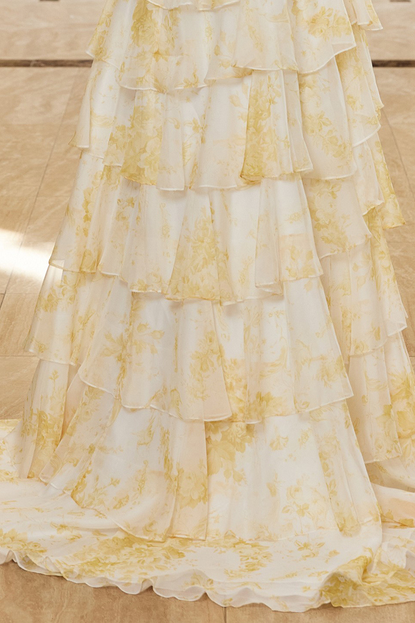 Color: YELLOW Size:- Strapless Floral Print A Line Ruffle Dress