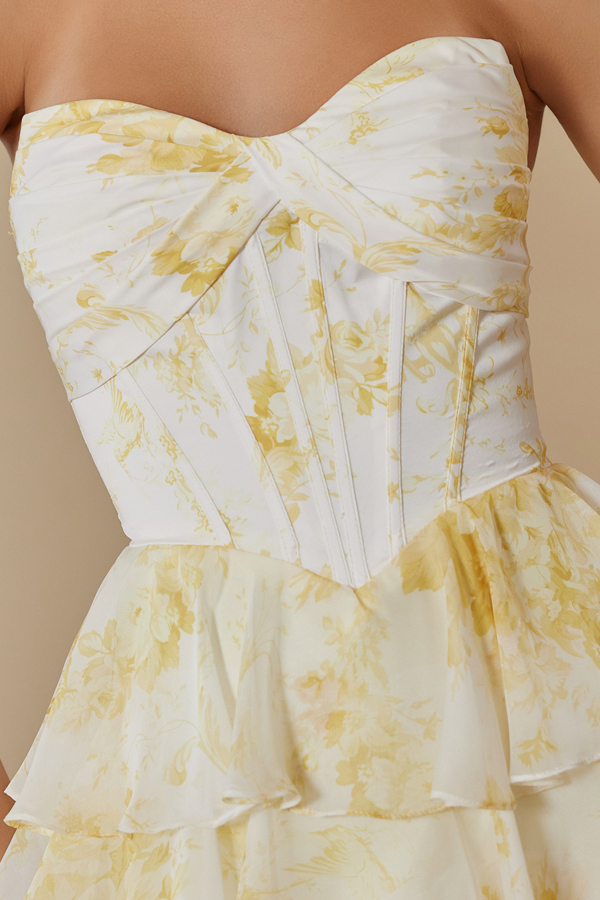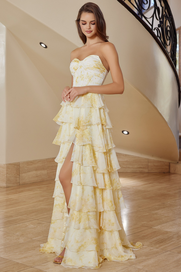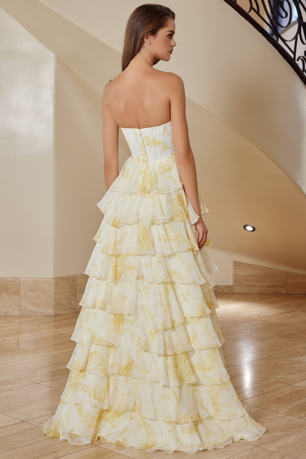 Color: YELLOW Size:- Strapless Print Dress w/ Tier Skirt