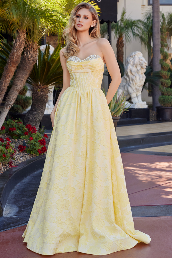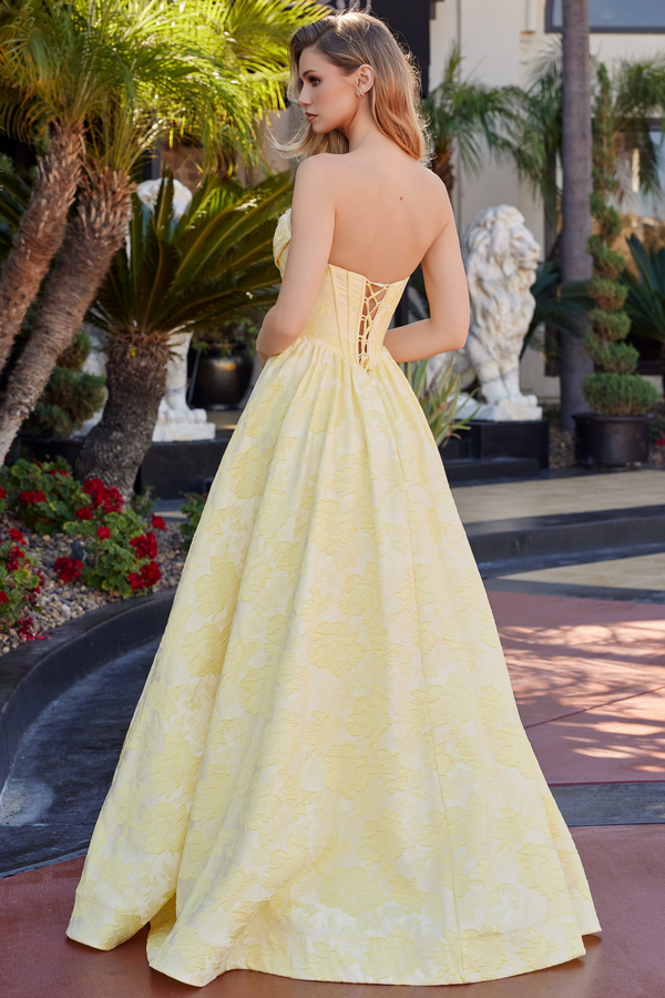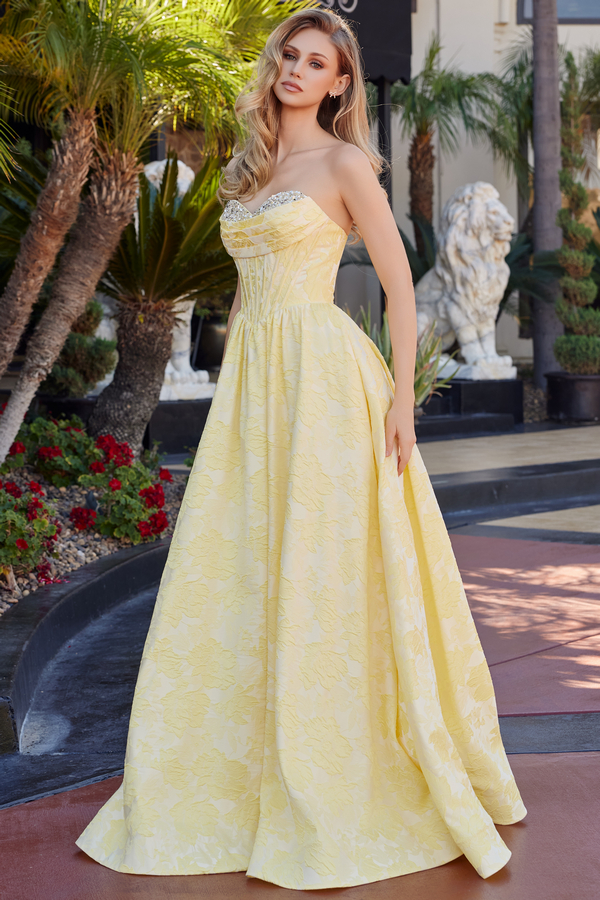 LONG BALL GOWN IN A JACQUARD MATERIAL WITH A SWEETHEART PLEATED BUST LINE ADORNED WITH SILVER SEQUINS BONED WAISTLINE AND A LACE-UP BACK THE SWEETHEART NECKLINE FEATURES A PLEATED BUST LINE ADORNED WITH SHIMMERING SILVER SEQUINS, ADDING A TOUCH OF GLAMOUR.