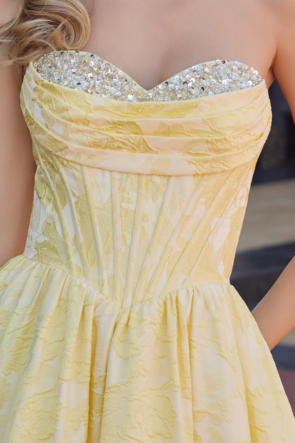 THE BACK OF THE DRESS BOASTS A LACE-UP CLOSURE.Colors: Lilac, Sage Green, Yellow.