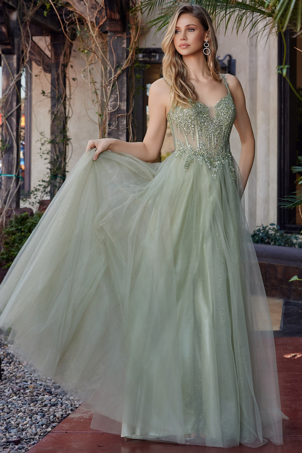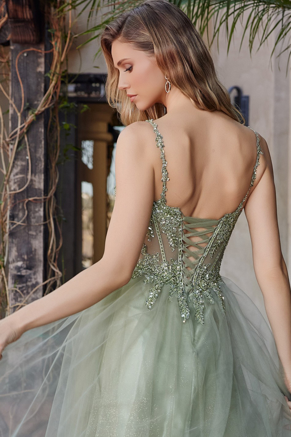 LONG TULLE GOWN WITH PLUNGING V NECKLINE SPAGHETTI STRAPS SHEER WAISTLINE WITH SEQUINED AND BEADED APPLIQUE BODICE AND A LACE UP BACK AND SWEEPING TRAIN.
