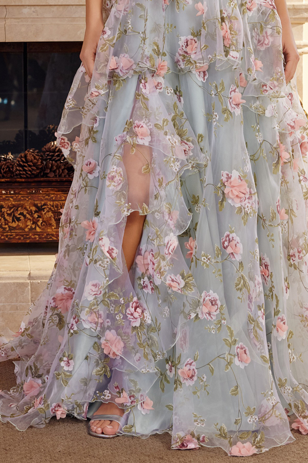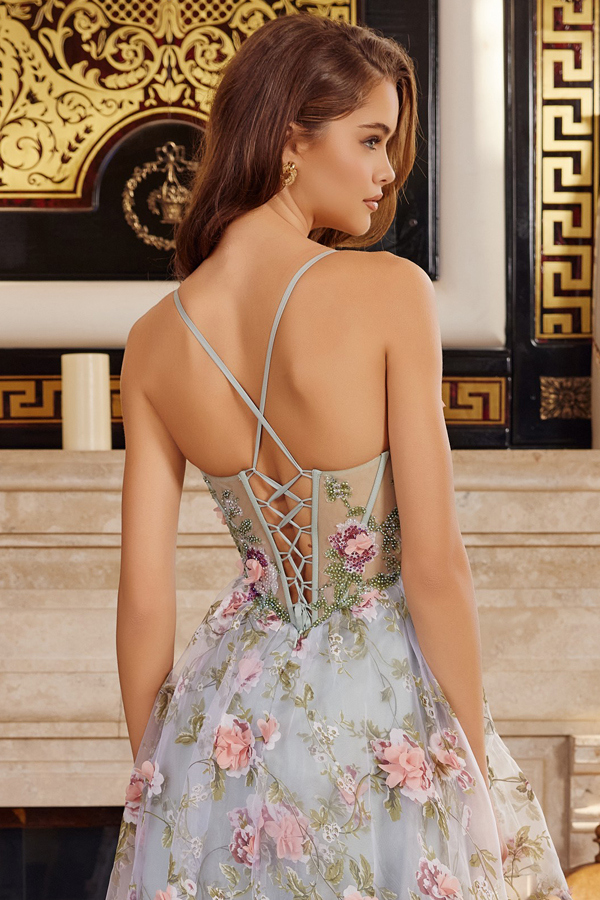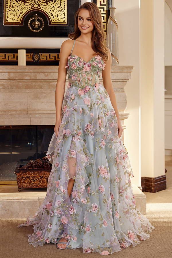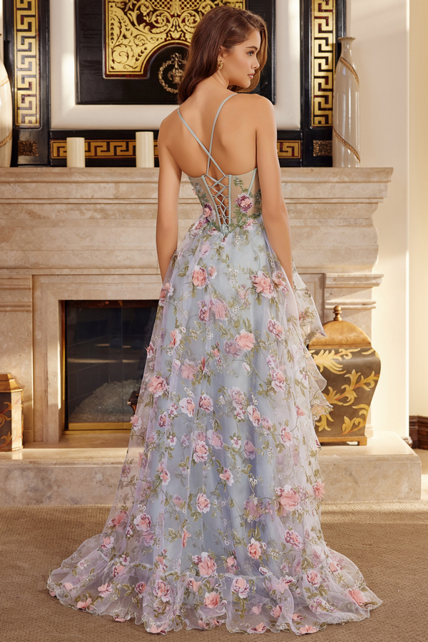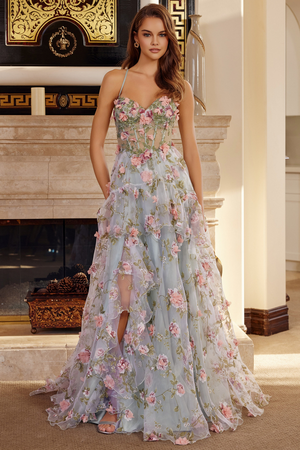 LONG ORGANZA BALL GOWN WITH FULL FLOWER APPLIQUE V BUSTLINE SPAGHETTI STRAPS AND A SHEER BONED WAISTLINE WITH A LAYERED SKIRT HIGH SLIT AND A LACE UP BACK.