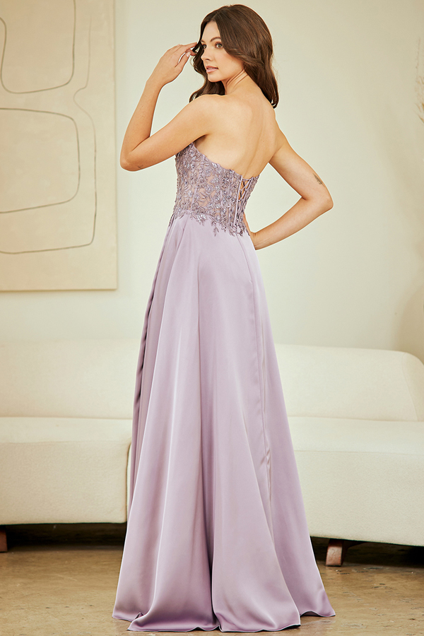 Strapless Bead Laced Illusion Top A Line Prom Dress