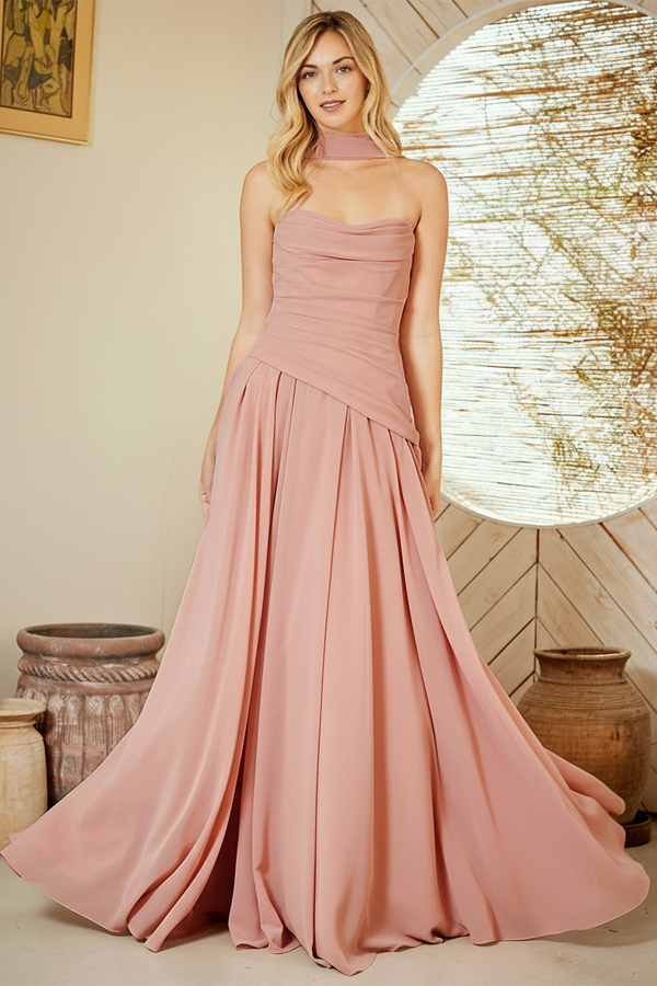 - Pleat Detail Strapless Chiffon A Line Dress