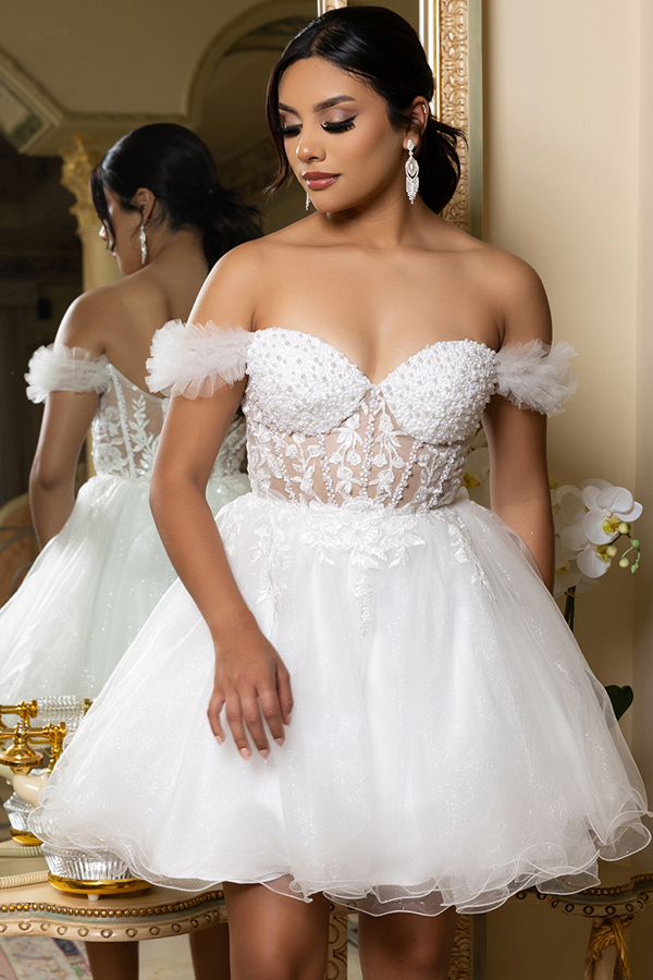 Features: Pear/Bead Embellished Illusion Top, Embroidery Design, Wired Skirt, Mini Length