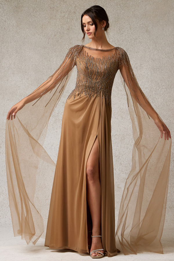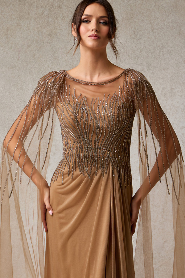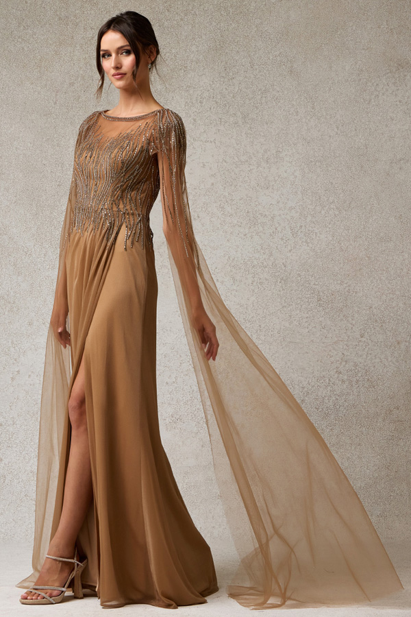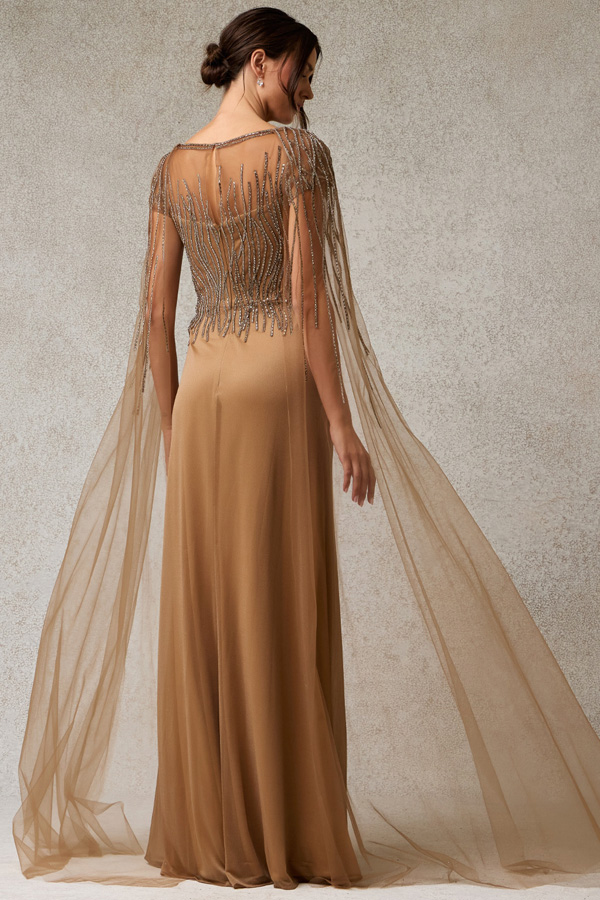 - Floor Length Capelet Boat Neck Sheath MoB Gown