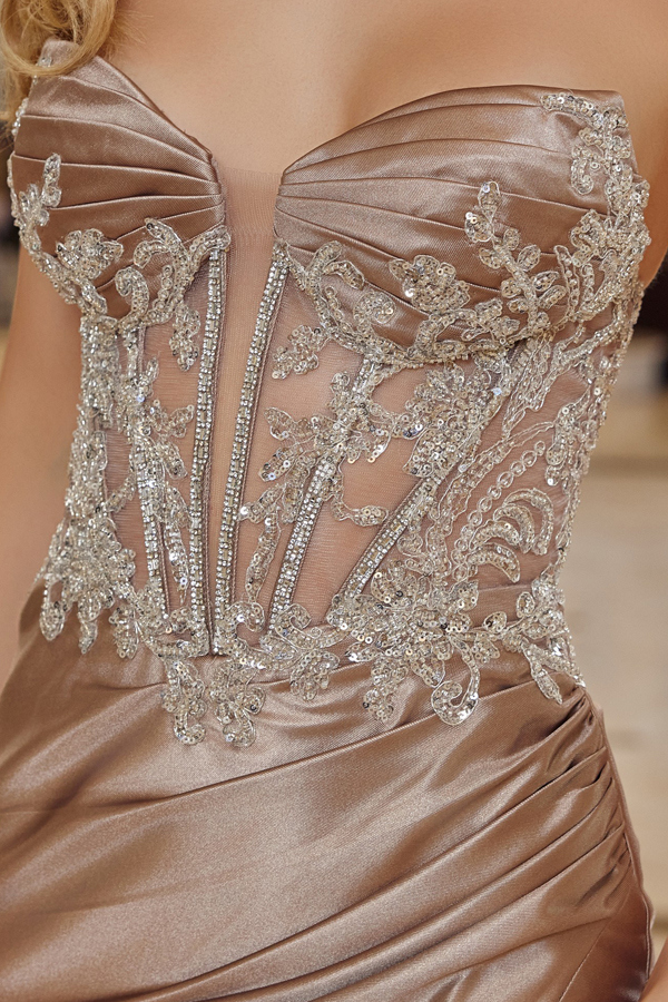 SHINY SATIN LONG STRAPLESS FITTED DRESS EMBELLISHED BY SILVER SEQUINED EMBROIDERY AND A PLUNGING BUSTLINE WITH LACE UP BACK A HIGH SLIT AND A SWEEPING TRAIN.