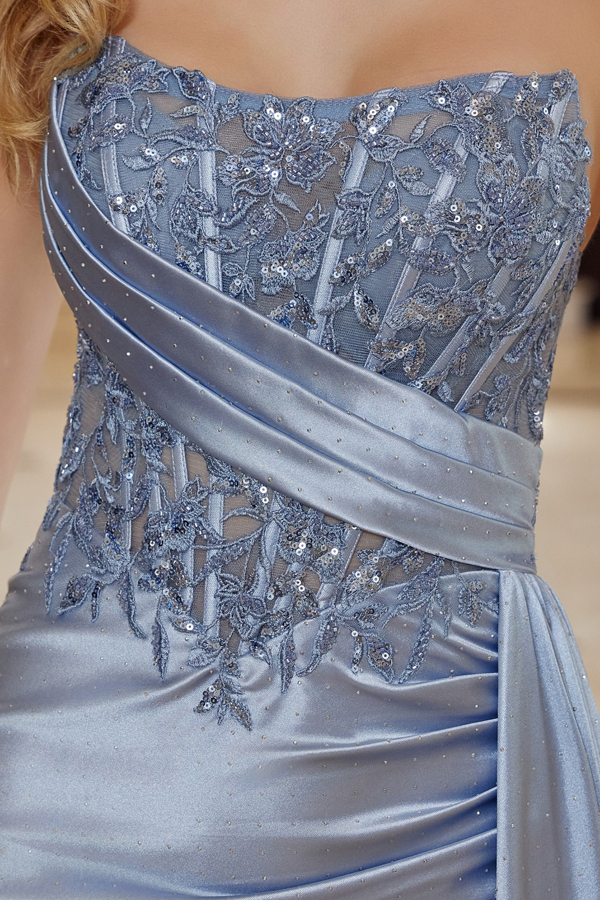 LONG STRAPLESS FIT AND FLARE WITH A BONED SHEER EMBROIDERED WAISTLINE FULLY ADORNED WITH HOT PRESSED STONES AND A HIGH SLIT A SIDE SASH AND LACE UP BACK.