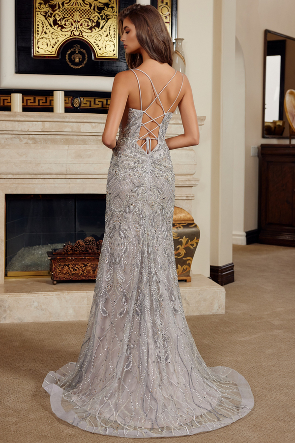 FITTED TULLE GOWN FULLY EMBELLISHED WITH WOVEN BEADS FOR COUTURE LEVEL SHIMMER A PEAKED NECKLINE AND SLIM SPAGHETTI STRAPS OFFERS A MODERN LOOK WHILE THE THIGH HIGH SLIT OFFER A LEG LENGTHENING EFFECT