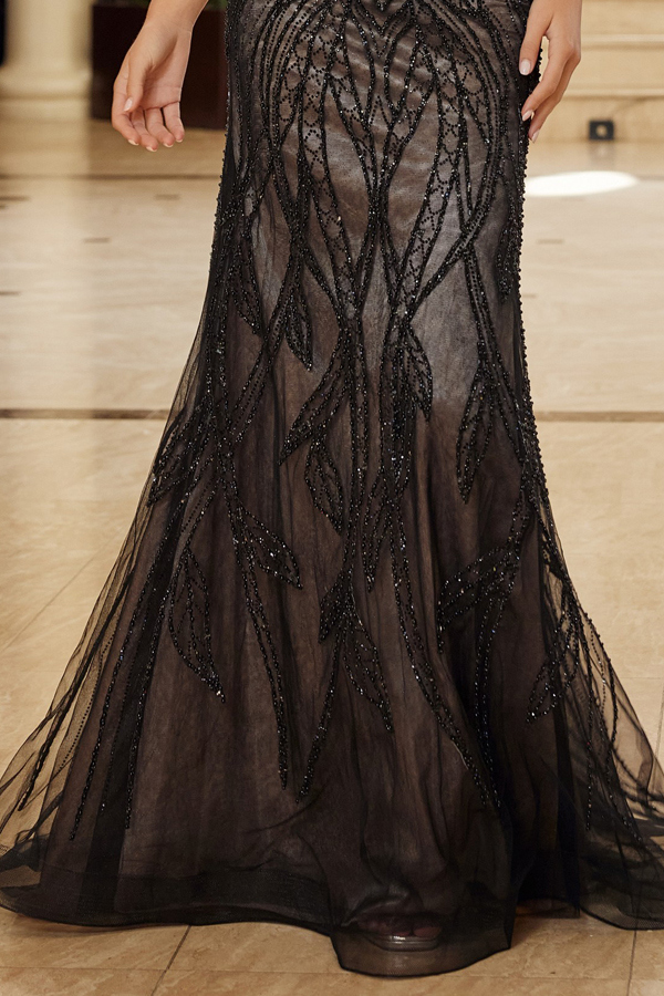 Color: BLACK/NUDE Size:- Strapless Keyhole Slit Top Beaded Evening Gown