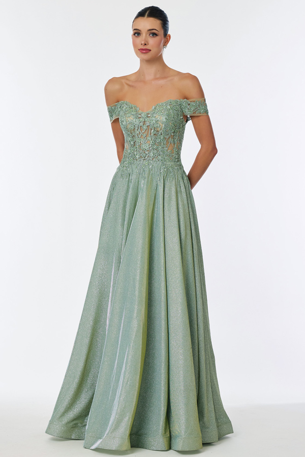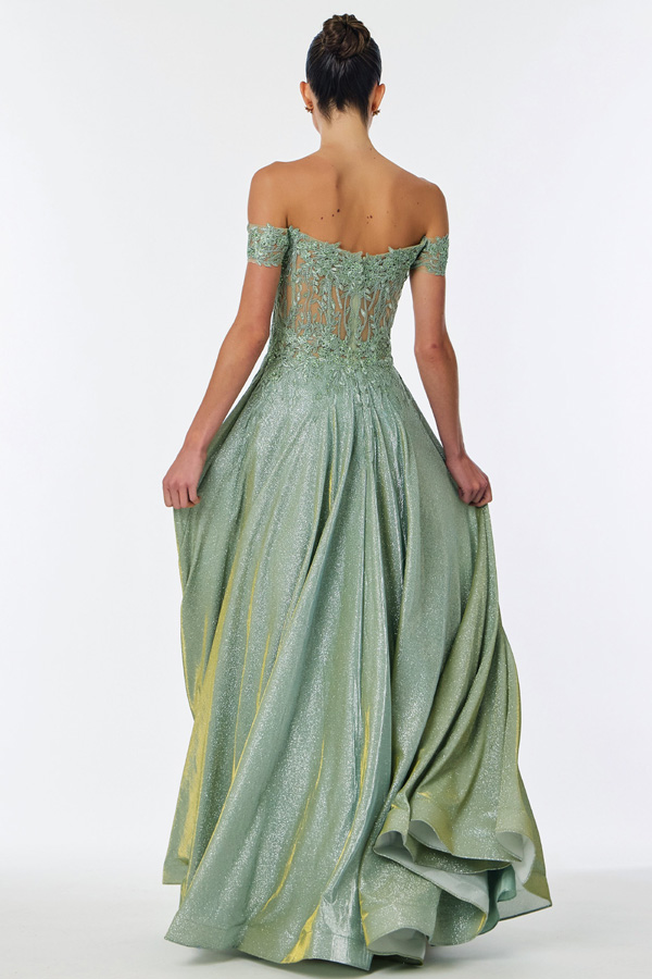 Color: SAGE Size:- Off Shoulder Embellished Top A Line Dress