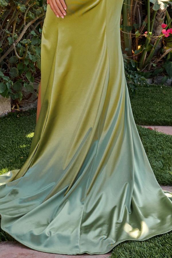 Designed for any formal event, this dress features embellished spaghetti straps that frame a deep V-neckline corset bodice. The sheer bodice is richly adorned with beads, jewels, and sequins over a shimmering glitter underlayer, tapering into a flattering Basque waistline. The stretch satin skirt showcases soft side pleating, a slit, and gathered detailing at the back for a sleek, figure-enhancing silhouette.