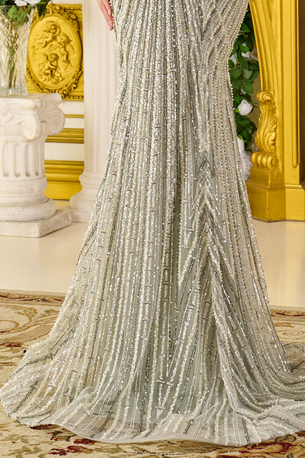 Mother of the bride/groom gown, lavishly adorned with shimmering beads, jewels, sequins, and 3D leaf appliques. The embellishments are arranged in graceful linear patterns that elongate the silhouette. A flattering V-neckline and structured off-shoulder straps frame the bodice, which is finished with a sparkling brooch at the center for an extra touch of glamour.