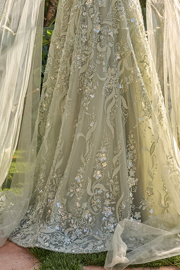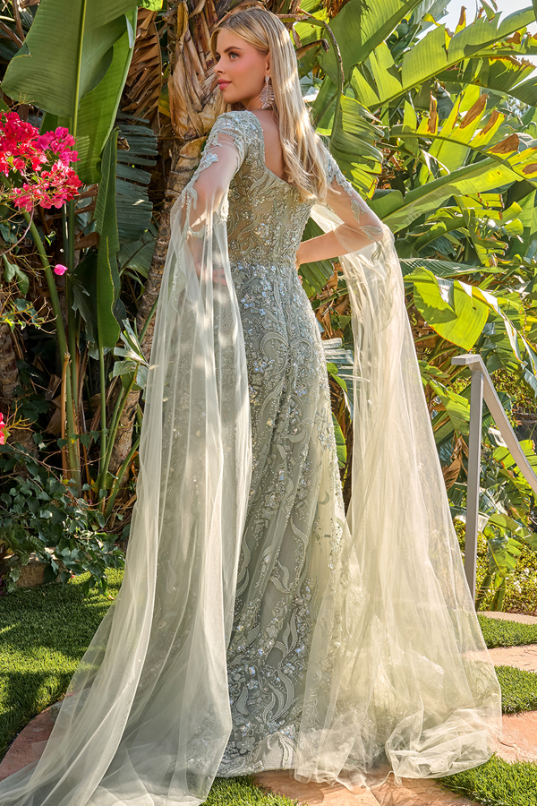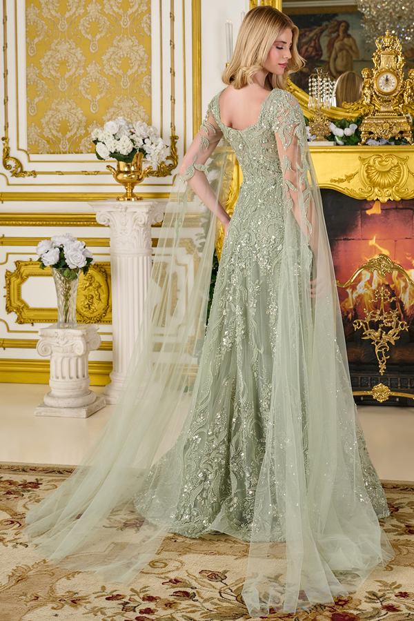 A-line mother of the bride/groom gown blends classic charm with intricate detailing. The dress features graceful cape sleeves and a flattering V-neckline that flows into an A-line skirt, offering both elegance and ease of movement. The entire gown is beautifully adorned with shimmering beads, sequins, embroidery, and 3D floral appliques, creating a romantic, textured finish.