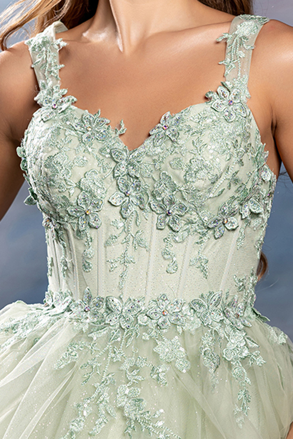 Features: Solid Design(Non-Illusion), 3D Floral Embroidery with Jewel Detail, Mesh Overlay Skirt. Lace-Up Fit.