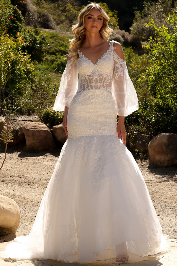 Sheer 3/4 Sleeve V Neck Cut-Out Shoulder Wedding Gown