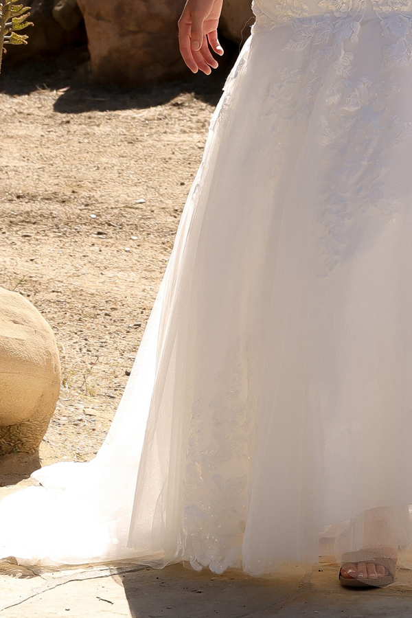 Features: V Neckline, Lace, Illusion Bodice, Chapel Length, Open V Back