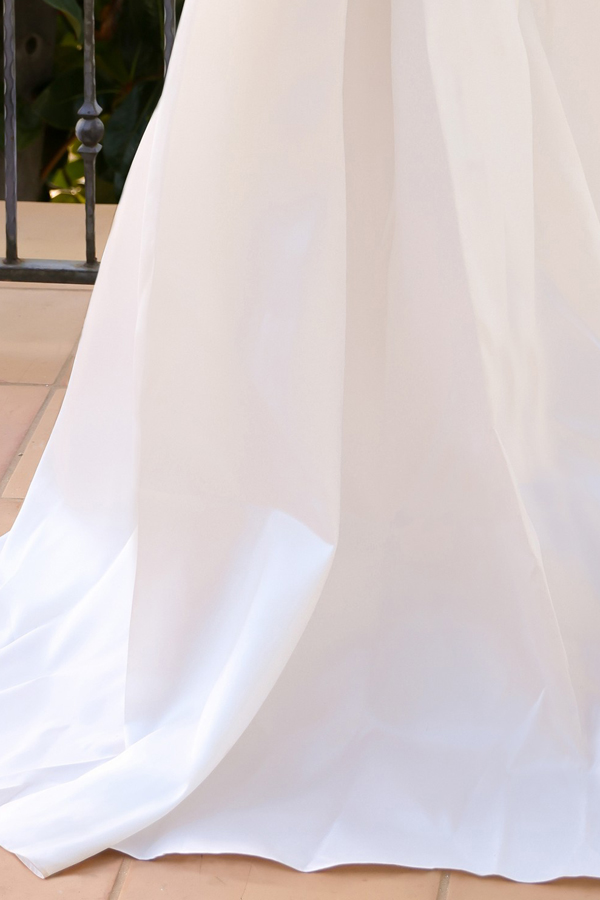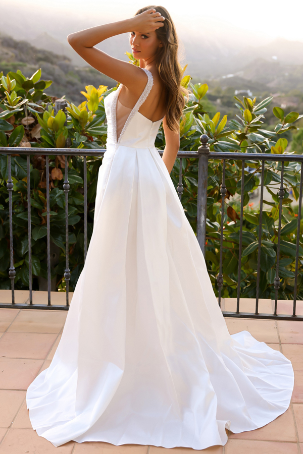 Sleeveless Square Neckline Fit and Flare Wedding Gown.