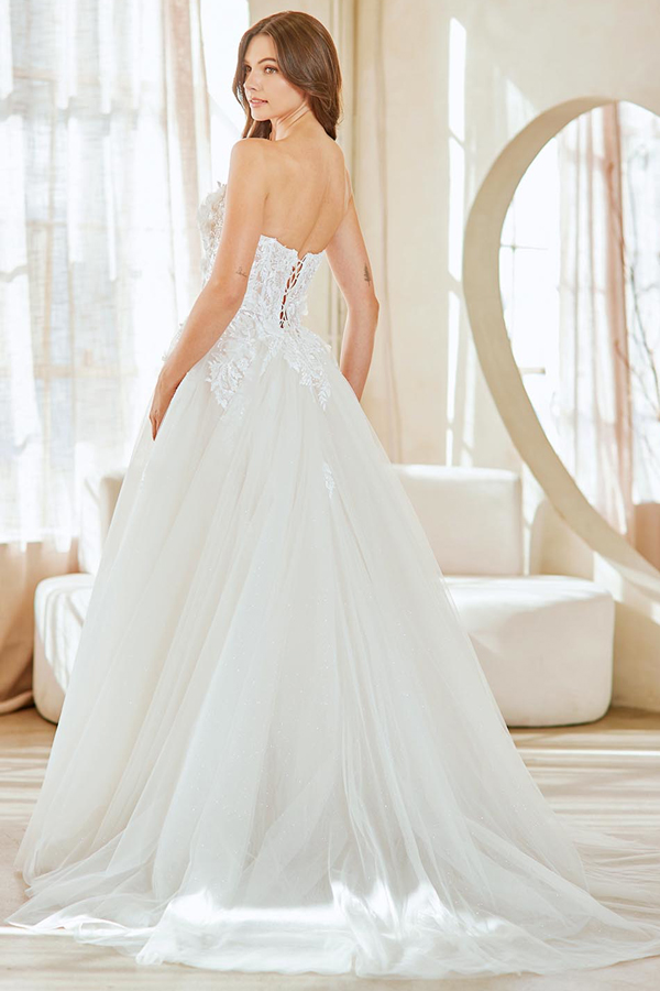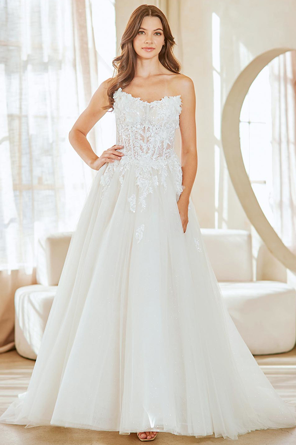 Strapless Bateau Neckline A Line Wedding Dress with Illusion Lace Top.