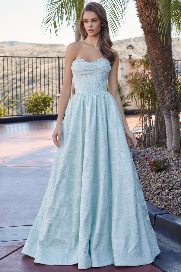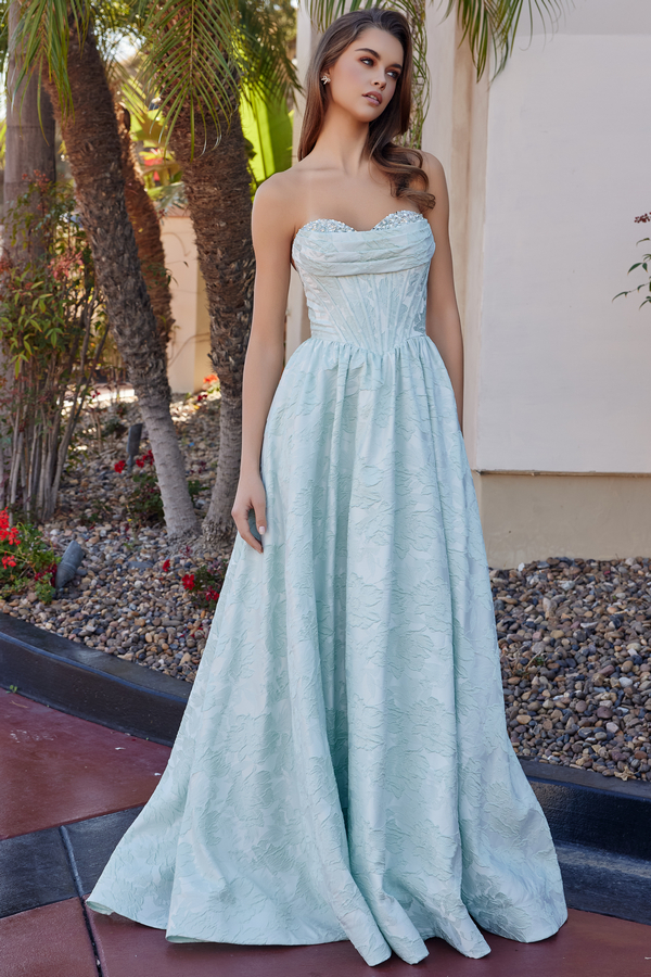 Color: SAGE GREEN Size:- Strapless Sweetheart A Line Jacquard Dress