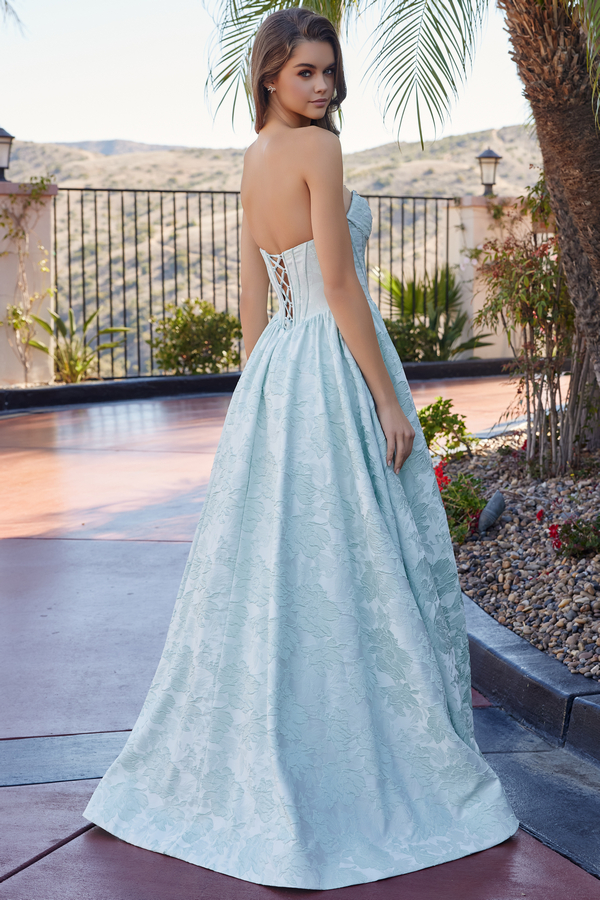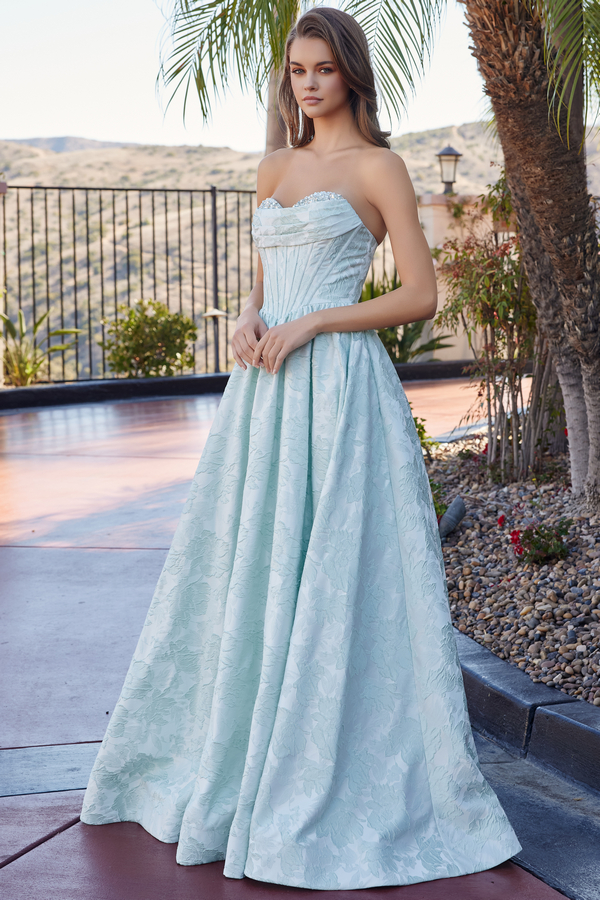 LONG BALL GOWN IN A JACQUARD MATERIAL WITH A SWEETHEART PLEATED BUST LINE ADORNED WITH SILVER SEQUINS BONED WAISTLINE AND A LACE-UP BACK THE SWEETHEART NECKLINE FEATURES A PLEATED BUST LINE ADORNED WITH SHIMMERING SILVER SEQUINS, ADDING A TOUCH OF GLAMOUR.