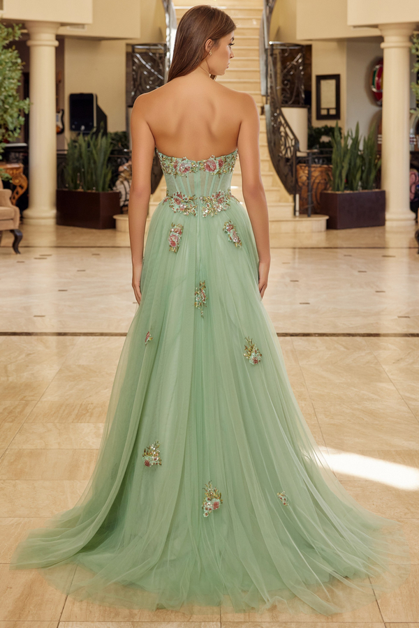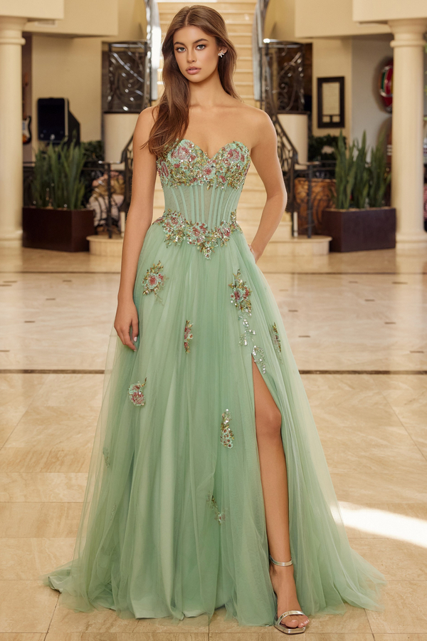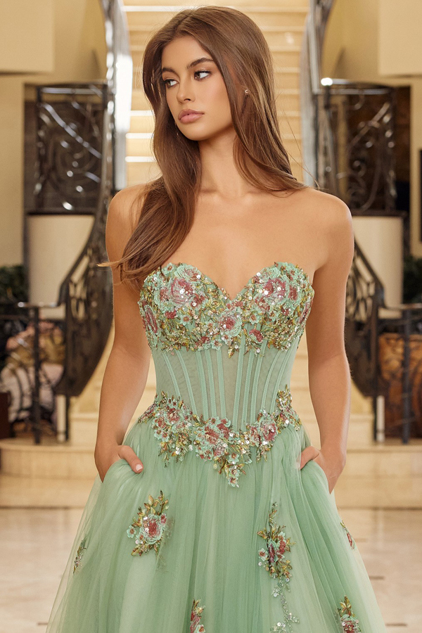 STRAPLESS TULLE BALL GOWN ADORNED WITH FLORAL SEQUINED EMBROIDERY SHEER BONED WAISTLIN HIGH SLIT AND BACK ZIPPER.