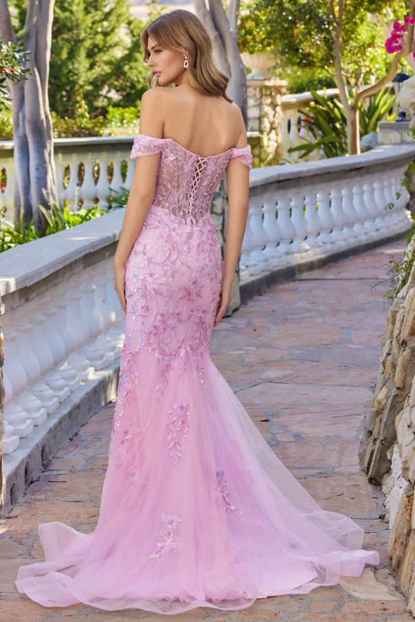 Off-shoulder gown with a structured corset bodice featuring sheer paneling, defined cup shaping, and lace-up back closure for adjustable support. Fitted silhouette highlights the waist and hips before extending into a flared hem with a light train. Floral appliqué and beadwork add dimension throughout the bodice and skirt. Designed for formal events, pageants, and occasions that call for a refined, detailed look.