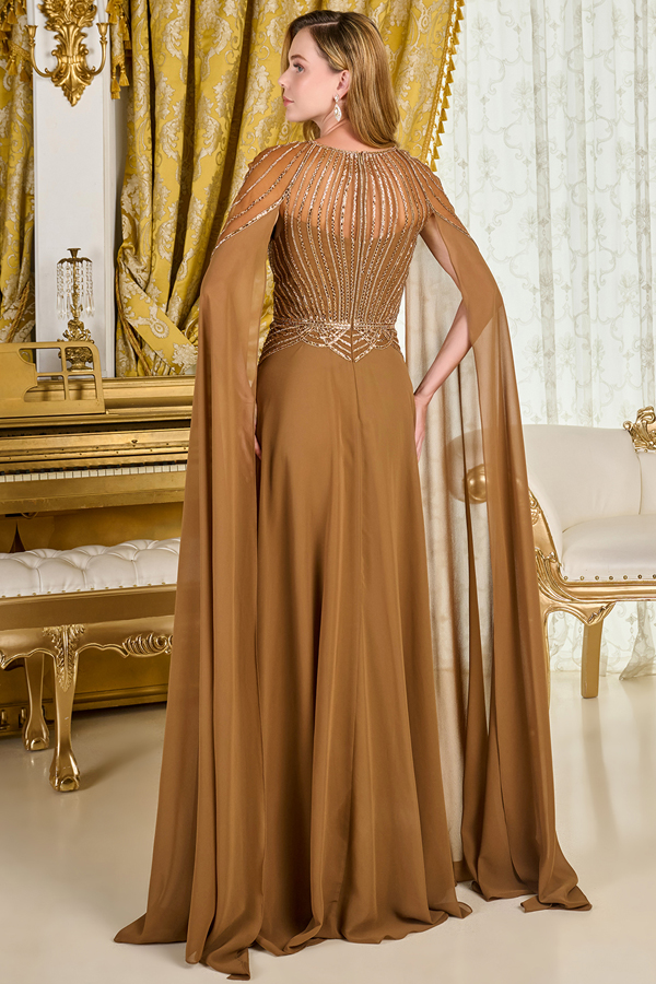 Color: BROWNGraceful and refined, this A-line mother of the bride/groom dress features a sheer scoop neckline that offers a touch of elegance. The bodice and cape sleeves are beautifully embellished with sparkling jewels. Flowing chiffon composes the skirt and draped cape sleeves, creating soft, graceful movement with every step. A discreet zipper closure at the back ensures a smooth, flattering fit.