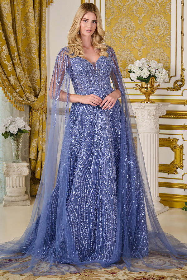 Blending timeless design with contemporary detailing, this mother of the bride or groom gown shimmers with intricate beadwork and sequins throughout. The flattering A-line silhouette features a V-neckline at both the front and back. Flowing cape sleeves drape beautifully over the arms, adding graceful movement and sophistication to this formal look.