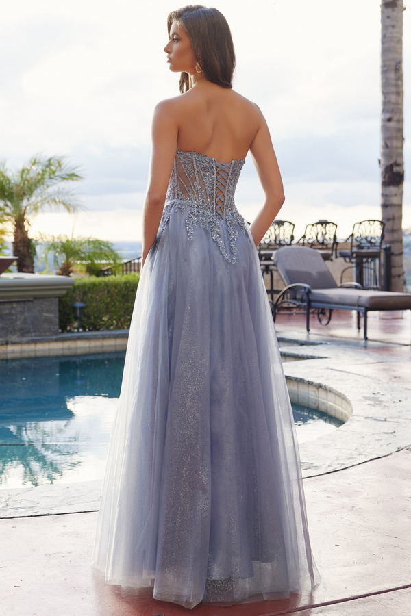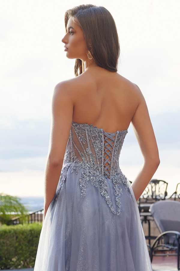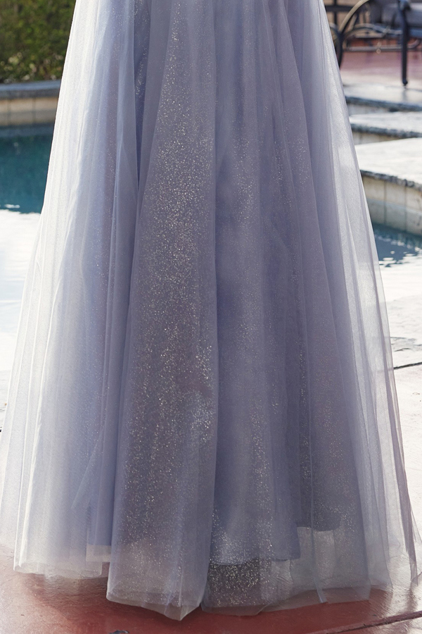 MESH GOWN WITH BONED BODICE AND LACE UP BACK A MODERN PEAKED NECKLINE SHARPENS THE SEQUIN EMBELLISHED BODICE THE A LINE GLITTER DUSTED SKIRT FALLS INTO A THIGH HIGH SLIT FOR AN ADDED GRACEFUL MOVEMENT.