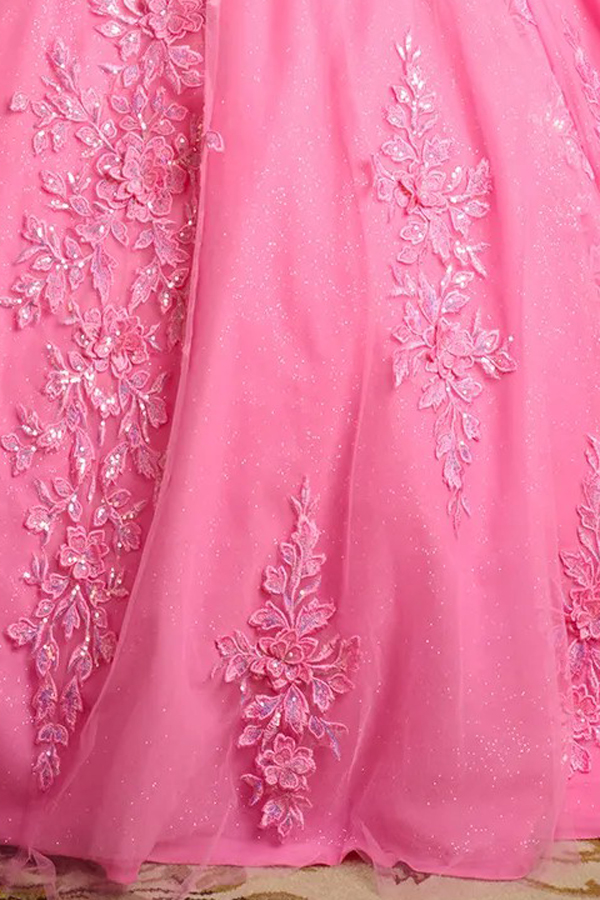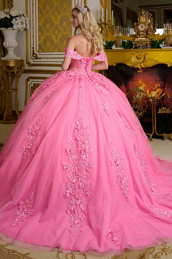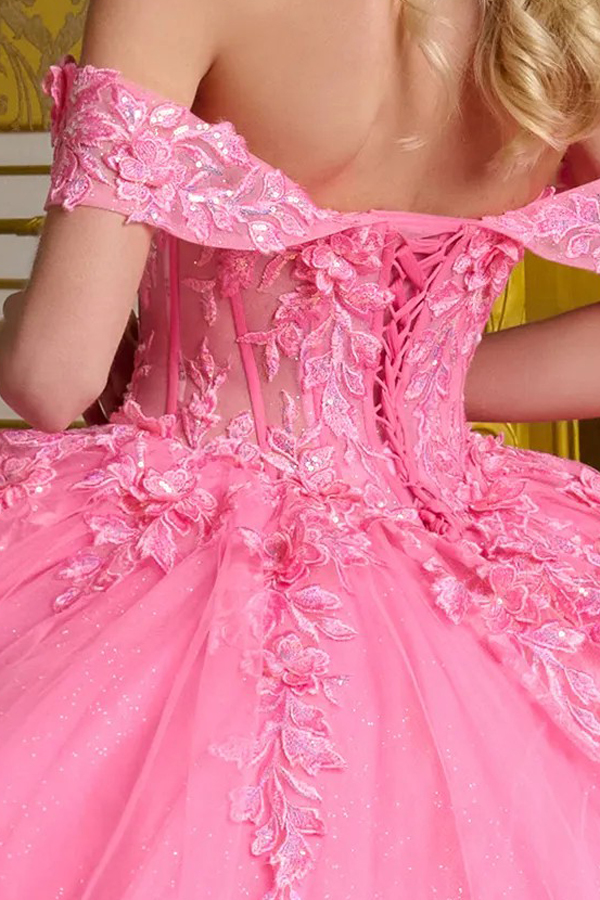 Off-the-shoulder straps seamlessly connected to a V-neckline sheer corset bodice. The bodice and straps are richly embellished with 3D floral appliqués, beads, embroidery, jewels, sequins, and glitter, creating a textured and opulent look. These intricate embellishments are thoughtfully placed throughout sections of the skirt, while a glitter underlayer lines the entire gown.
