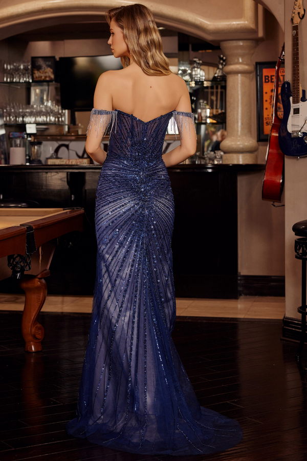 GLAMOUROUS FULLY BEADED FITTED GOWN WITH OFF SHOULDER BEADED FRINGE SLEEVES A BONED BODICE FOR A STRUCTURED SILHOUETTE COMPLETE WITH A ZIPPER BACK THE SKIRT FLOWS DOWN INTO AN ALLURING THIGH HIGH SLIT.