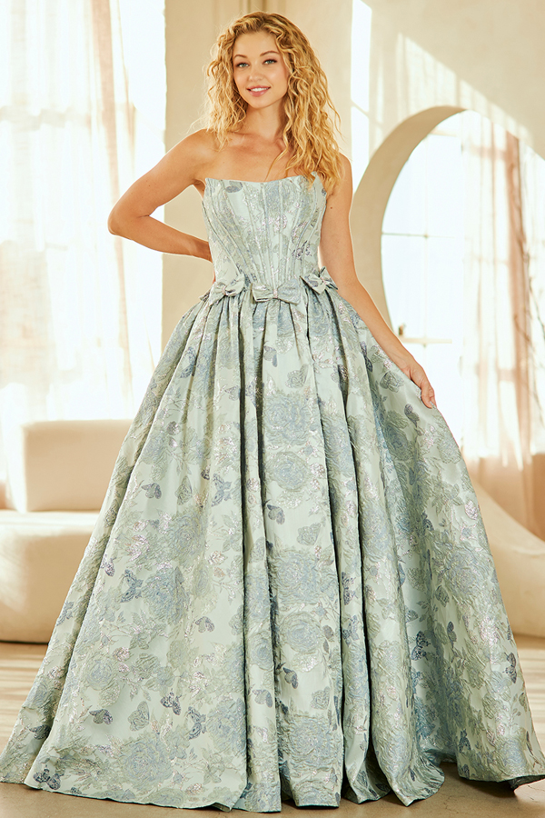 Strapless Bateau Neckline A-Line Jacquard Dress with Matching Jacquard Bow on the Waist.