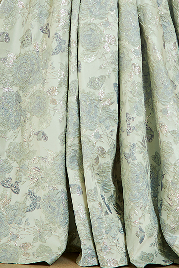 Features: Bone-In Corset Top, Pleat Skirt, Floor Length. Floral/Butterfly Pattern