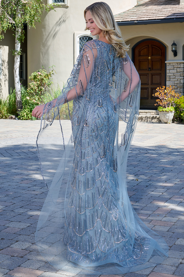 Fitted mother of the bride/groom dress is richly embellished with intricate beadwork, embroidery, and sequins, creating a luxurious, textured finish. A high-low mesh cape elegantly drapes over the shoulders and attaches at the V-neckline, cascading beautifully over the silhouette. The cape features a keyhole opening at the back, allowing easy access to the zipper closure beneath.