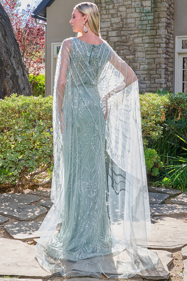 Mother of the bride/groom gown is adorned with an opulent mix of beads, jewels, and sequins that shimmer across a delicate lace base. The sleeveless design features shoulder straps and a flattering V-neckline, leading into a sleek, fitted silhouette that exudes sophistication. High-low mesh cape cascades gracefully from the bodice, offering soft coverage while allowing the embellishments beneath to shine through. The cape includes a keyhole back opening.