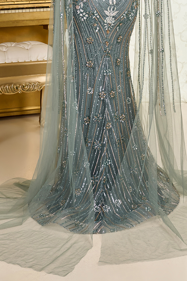 Make a sophisticated statement in this stunning mother of the bride/groom gown, richly adorned with sparkling beads and sequins for an elegant, refined look. An embellished mock neckline flows seamlessly into graceful cape sleeves, leading to a fitted silhouette that is designed to flatter. A concealed back zipper ensures a smooth, polished finish.