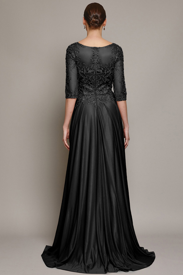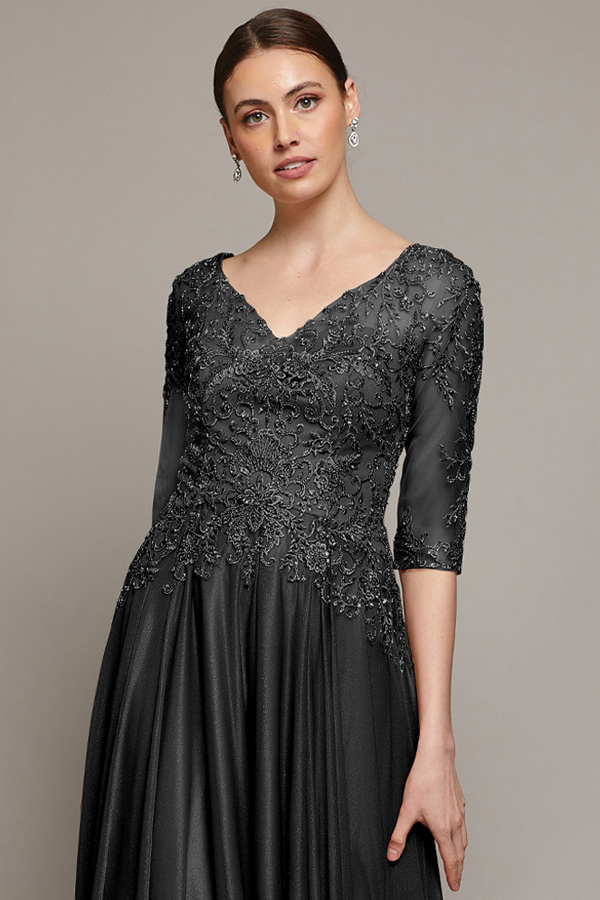 Color: BLACK Size:Sheer 3 Quarter Sleeve A-Line Mother of the Bride Dress. Shimmer Chiffon, Tulle, Embroidery/Beads/Rhinestone Detail.