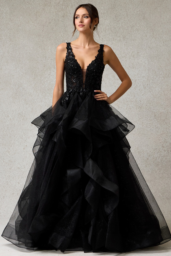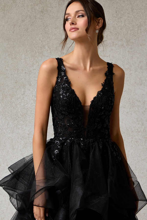- Sleeveless Plunging Neckline Tulle Ruffle Dress
