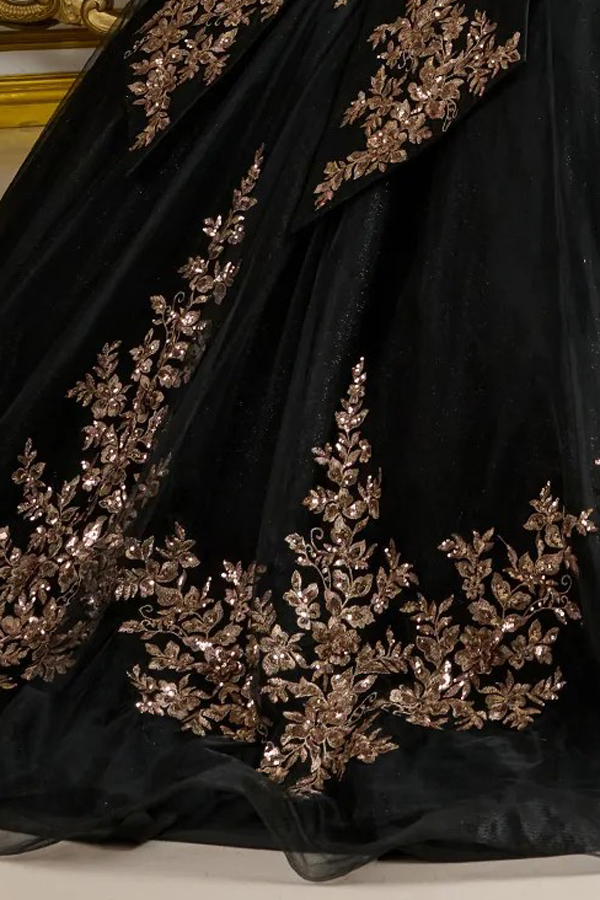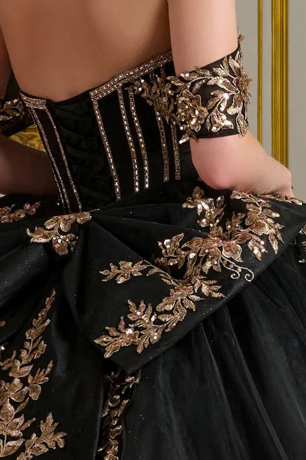 Adorned with 3D floral appliqués, embroidery, jewels, and sequins, the bejeweled bodice features a sweetheart neckline and matching detachable off-the-shoulder straps. These intricate embellishments continue along the waist and wrap around the train ball gown skirt, which has a glitter underlayer for added sparkle. At the back, a detachable bow with embellished tails echoes the ornate detailing found throughout the dress.