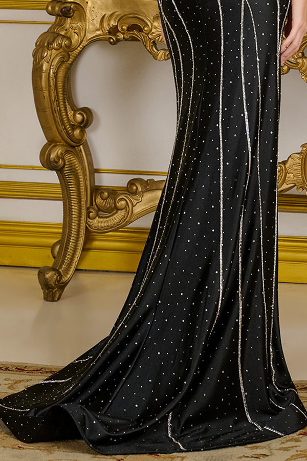 Color: BLACKA vision of elegance and light, this fitted floor-length gown glimmers with jewel trim that highlights every curve. The sheer, strapless corset bodice features a V-neckline, seamlessly flowing into a sleek stretch satin skirt. Additional jewel accents are scattered throughout the design, adding captivating shimmer and dimension from every angle.
