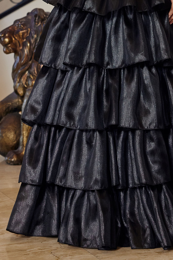 SHINY ORGANZA SCOOP BUSTLINE BEAD/SEQUIN WORK AND BONED WAISTLINE WITH SPAGHETTI STRAPS AND A MULTI LAYER SKIRT LACE UP BACK