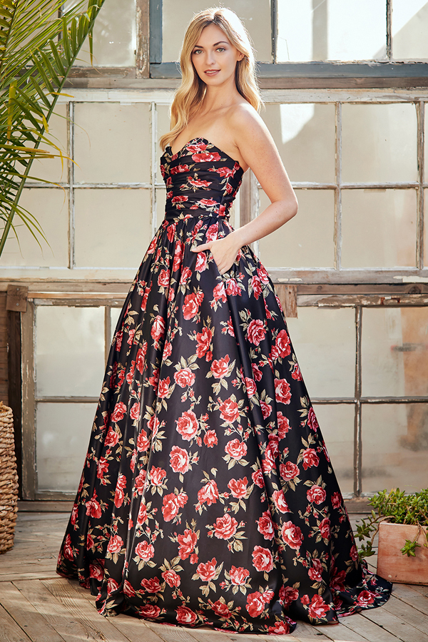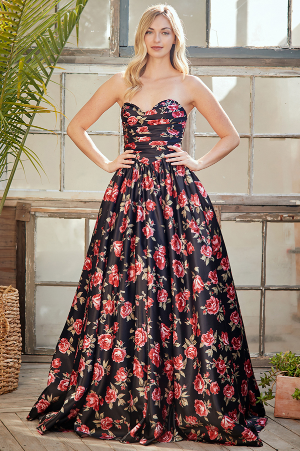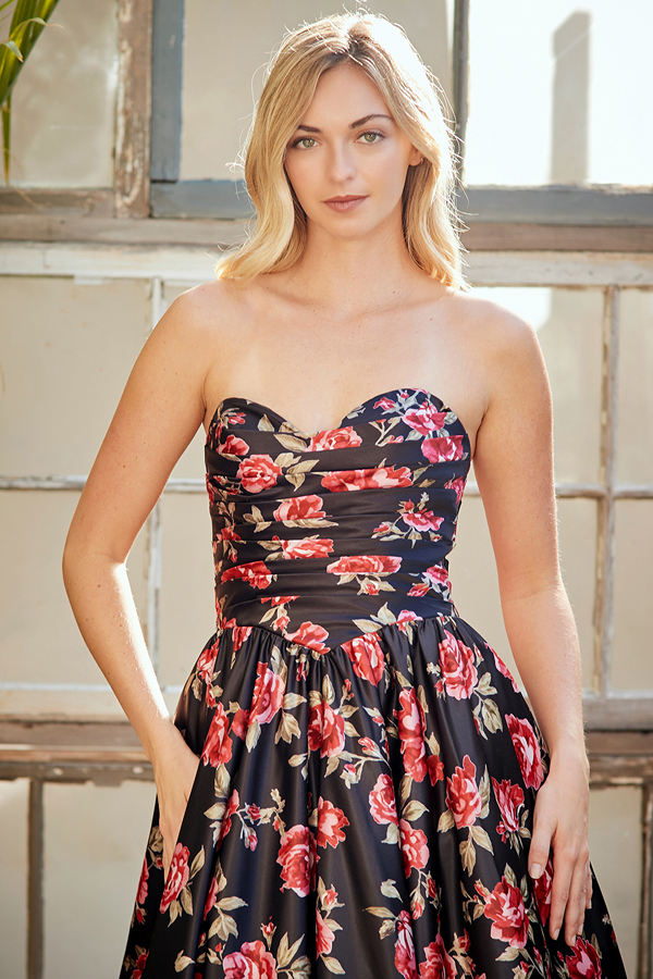 A Line Floral Print Dress w/ Strapless Sweetheart Top.