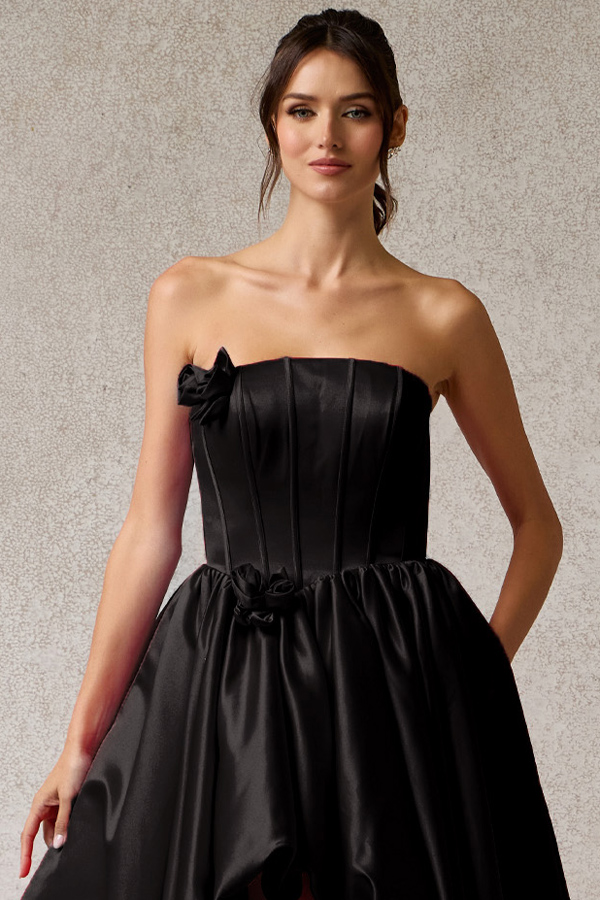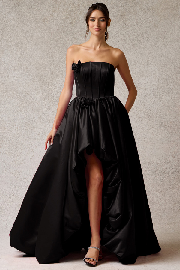 Strapless Straight Neckline Long Bubble Hem Satin A Line Dress.